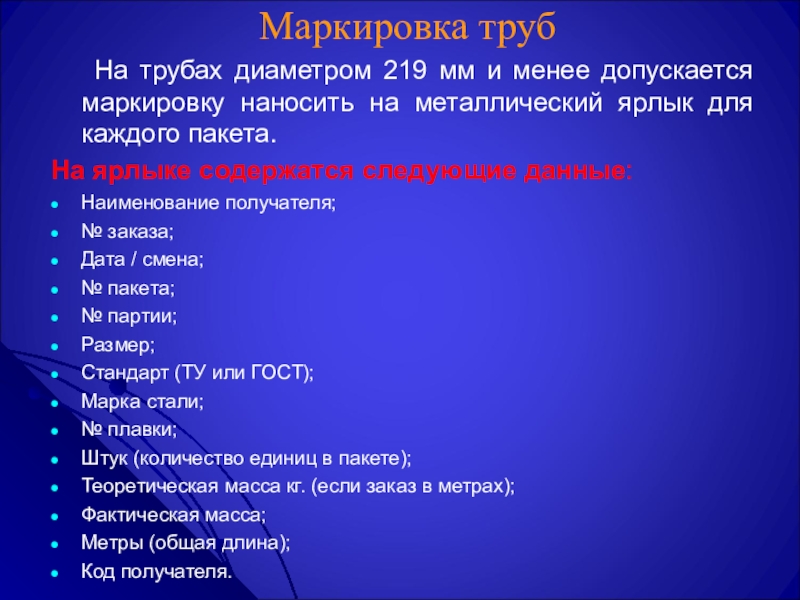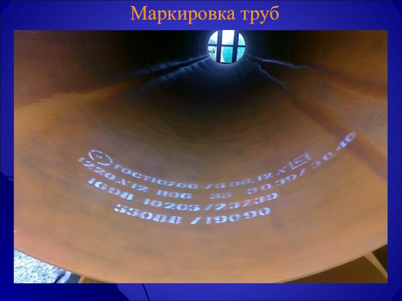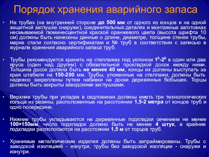 от одного из концов и на одной защитной заглушке снаружи), соединительных деталях и монтажных заготовках несмываемой люминесцентной краской оранжевого цвета (высота шрифта 10 см) должны быть нанесены данные о длине, диаметре, толщине стенки трубы, марке стали согласно сертификатам и № труб в соответствии с записью в журнале хранения аварийного запаса труб.