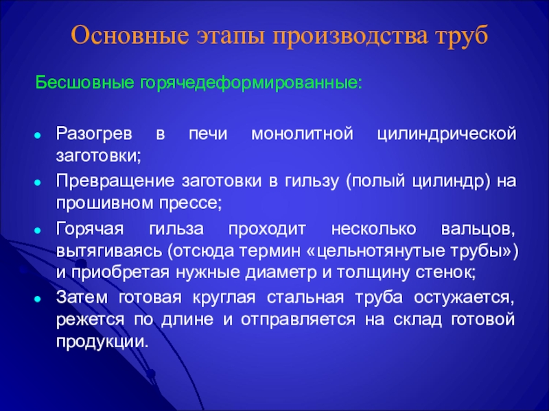 Горячая гильза проходит несколько вальцов, вытягиваясь (отсюда термин «цельнотянутые трубы») и приобретая нужные диаметр и толщину стенок;