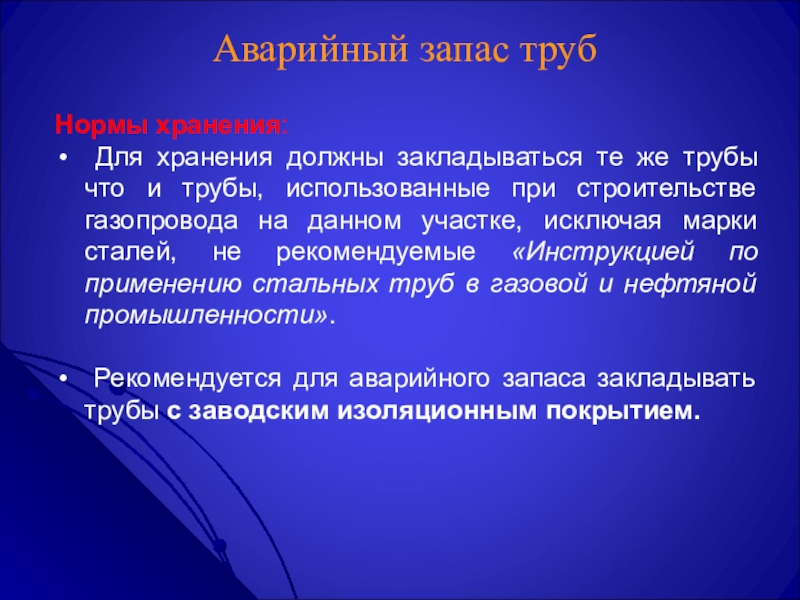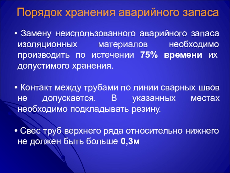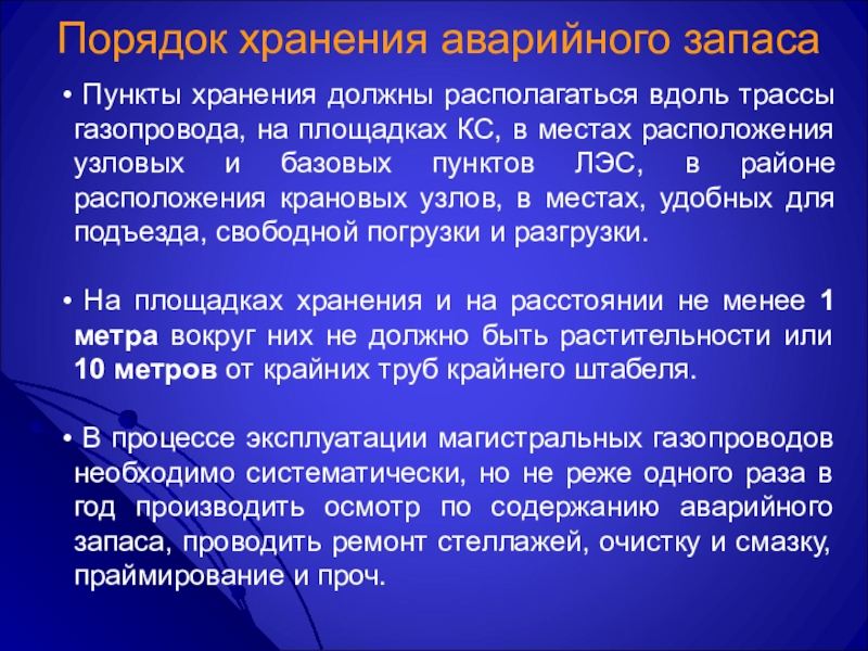 В процессе эксплуатации магистральных газопроводов необходимо систематически, но не реже одного раза в год производить осмотр по содержанию аварийного запаса, проводить ремонт стеллажей, очистку и смазку, праймирование и проч.