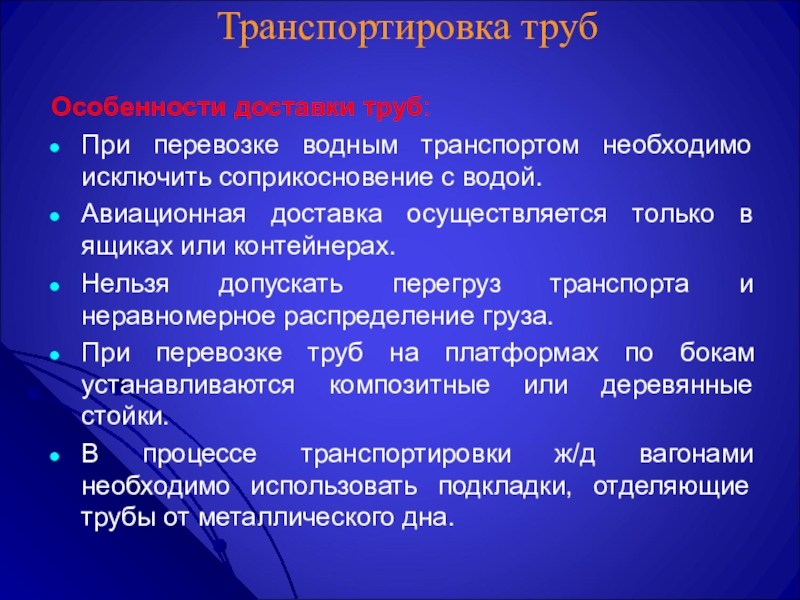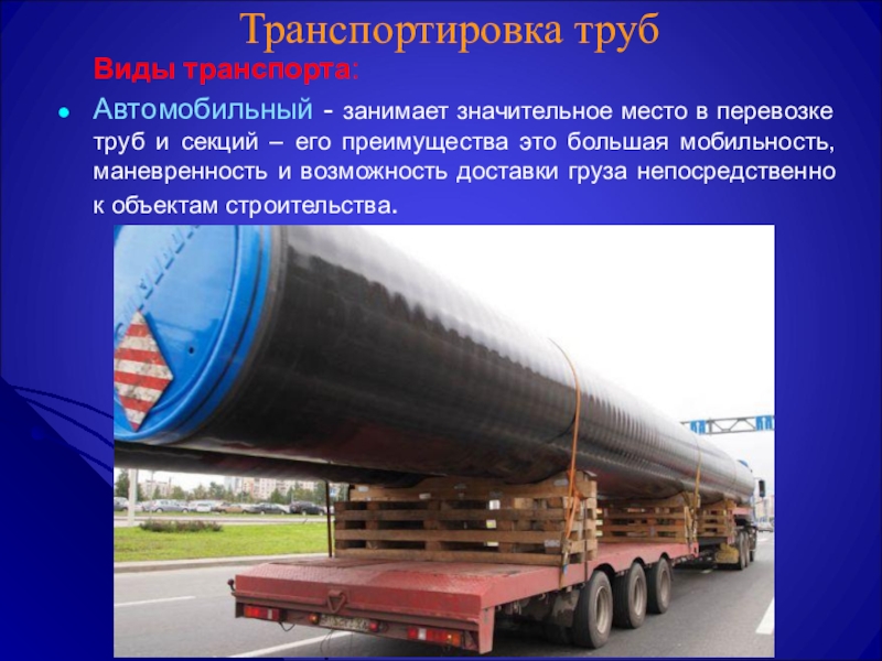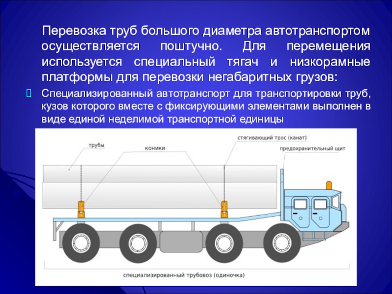 Слайд 48 Перевозка труб большого диаметра автотранспортом осуществляется поштучно. Для перемещения