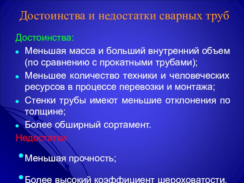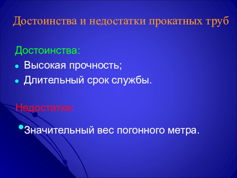 -: большой вес, большой расход металла, хрупкость, сложность в изготовлении труб малых диаметров;