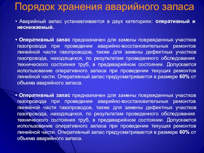 Оперативный запас предназначен для замены поврежденных участков газопровода при проведении аварийно-восстановительных ремонтов линейной части газопроводов, также для замены дефектных участков газопровода, находящихся, по результатам проведенного обследования технического состояния труб, в предаварийном состоянии. Допускается использование оперативного запаса при проведении текущих ремонтов линейной части. Оперативный запас предусматривается в размере 60% от объема аварийного запаса.