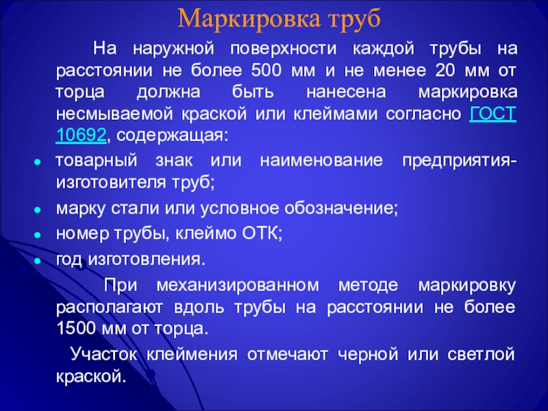 более 500 мм и не менее 20 мм от торца должна быть нанесена маркировка несмываемой краской или клеймами согласно ГОСТ 10692, содержащая: