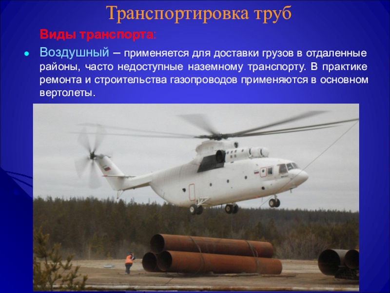 отдаленные районы, часто недоступные наземному транспорту. В практике ремонта и строительства газопроводов применяются в основном вертолеты.