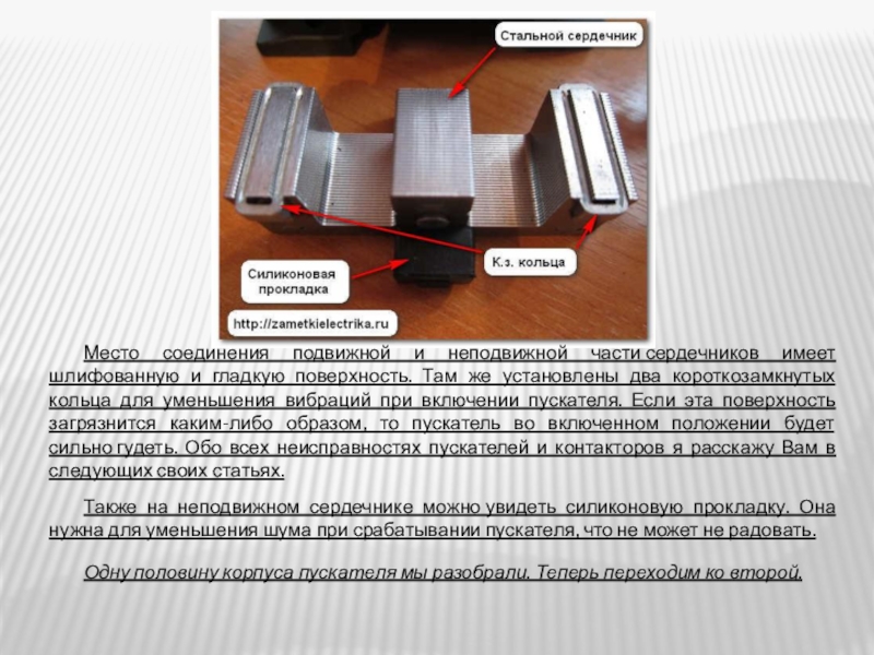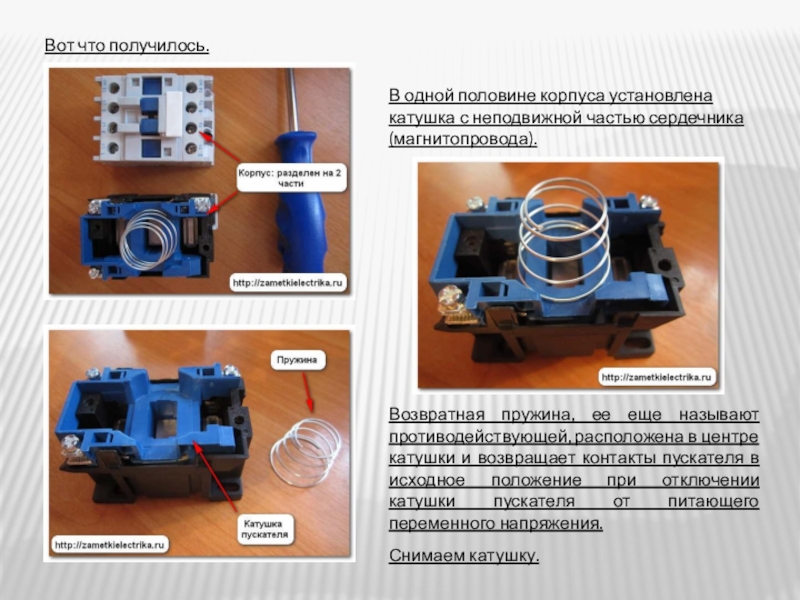 Возвратная пружина, ее еще называют противодействующей, расположена в центре катушки и возвращает контакты пускателя в исходное положение при отключении катушки пускателя от питающего переменного напряжения.