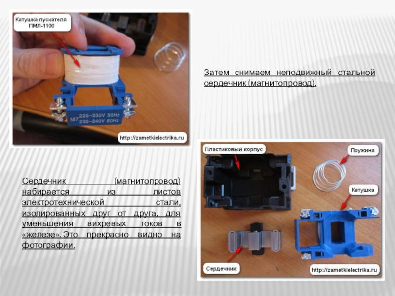 Катушка является съемной (дальше мы поговорим как добраться до катушки), поэтому ее можно поменять на другой номинал, например, на 380 (В). В продаже они имеются. У себя на предприятии катушки для пускателей и контакторов мы мотаем самостоятельно по данным сгоревших катушек.