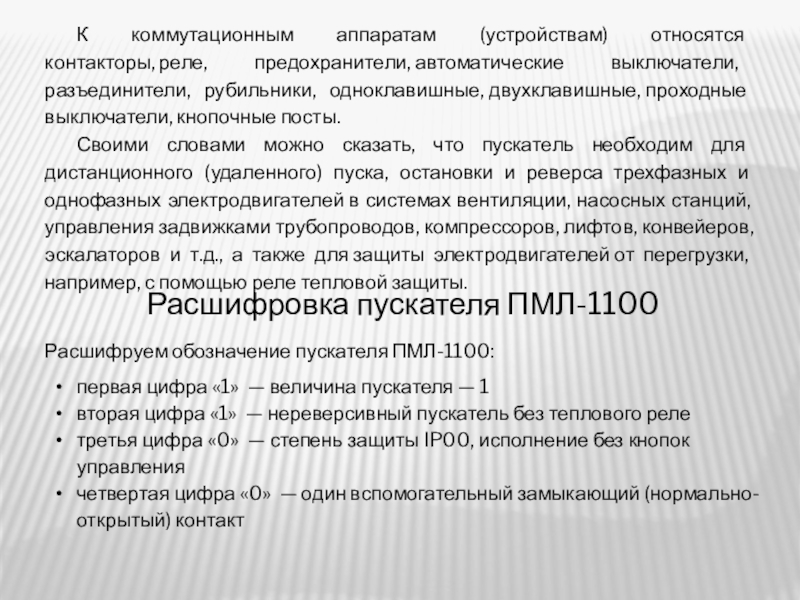 Расшифруем обозначение пускателя ПМЛ-1100: