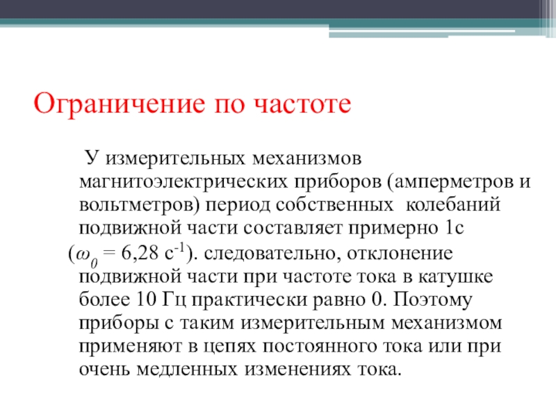 (ω0 = 6,28 с-1). следовательно, отклонение подвижной части при частоте тока в катушке более 10 Гц практически равно 0. Поэтому приборы с таким измерительным механизмом применяют в цепях постоянного тока или при очень медленных изменениях тока.