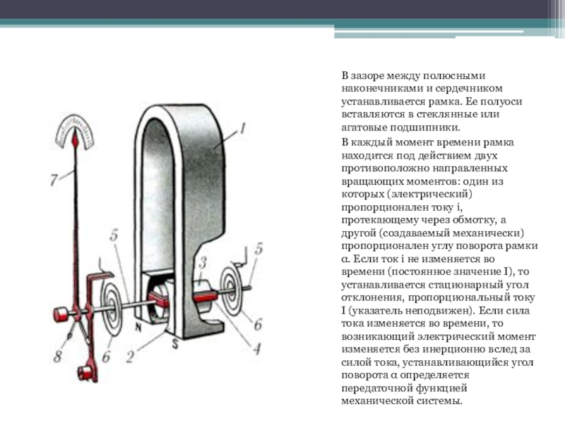 Слайд 4В зазоре между полюсными наконечниками и сердечником устанавливается рамка. Ее полуоси