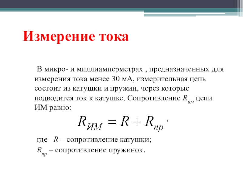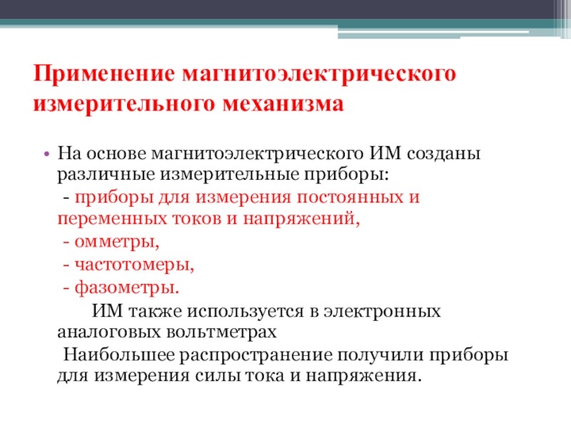 Слайд 15Применение магнитоэлектрического измерительного механизма