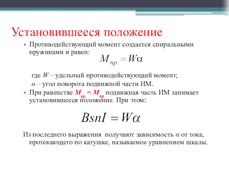 При равенстве Мвр = Мпр подвижная часть ИМ занимает установившееся положение. При этом: