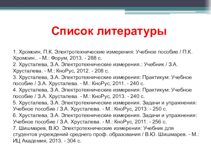 6. Хрусталева, З.А. Электротехнические измерения. Задачи и упражнения: Учебное пособие / З.А. Хрусталева. - М.: КноРус, 2011. - 256 c.