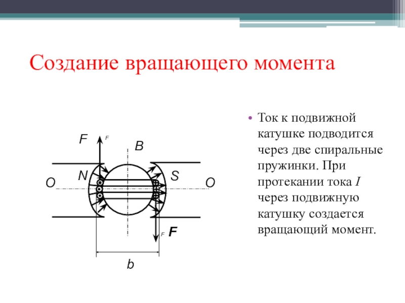 При протекании тока I через подвижную катушку создается вращающий момент.