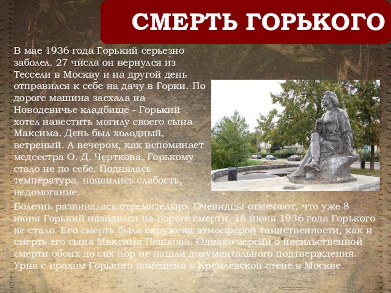 Болезнь развивалась стремительно. Очевидцы отмечают, что уже 8 июня Горький находился на пороге смерти. 18 июня 1936 года Горького не стало. Его смерть была окружена атмосферой таинственности, как и смерть его сына Максима Пешкова. Однако версии о насильственной смерти обоих до сих пор не нашли документального подтверждения. Урна с прахом Горького помещена в Кремлевской стене в Москве.