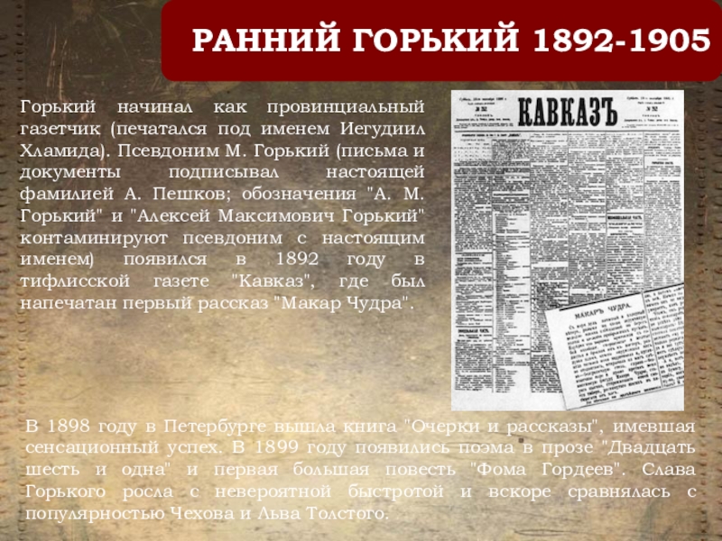 В 1898 году в Петербурге вышла книга "Очерки и рассказы", имевшая сенсационный успех. В 1899 году появились поэма в прозе "Двадцать шесть и одна" и первая большая повесть "Фома Гордеев". Слава Горького росла с невероятной быстротой и вскоре сравнялась с популярностью Чехова и Льва Толстого.