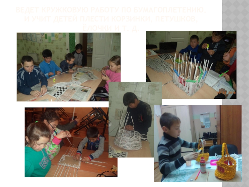 Слайд 5ведет кружковую работу по бумагоплетению. И учит детей плести корзинки, петушков,