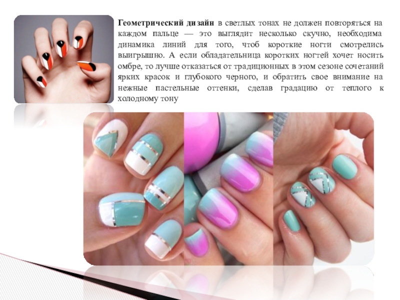 Слайд 5Геометрический дизайн в светлых тонах не должен повторяться на каждом пальце
