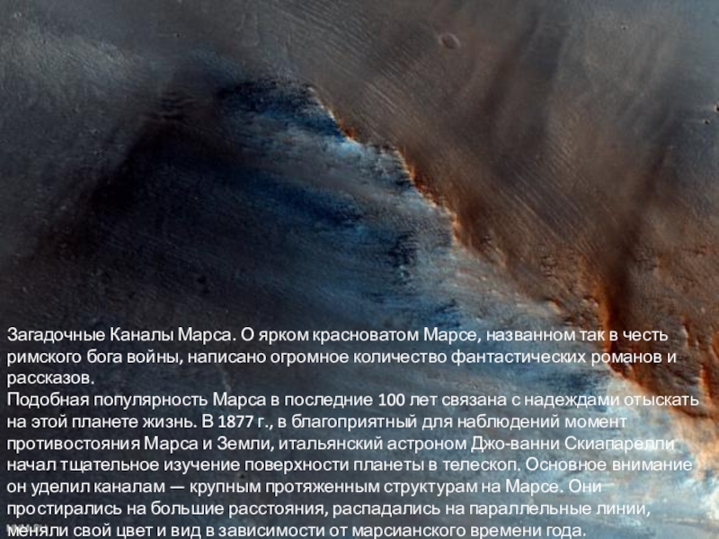 Слайд 11Загадочные Каналы Марса. О ярком красноватом Марсе, названном так в честь