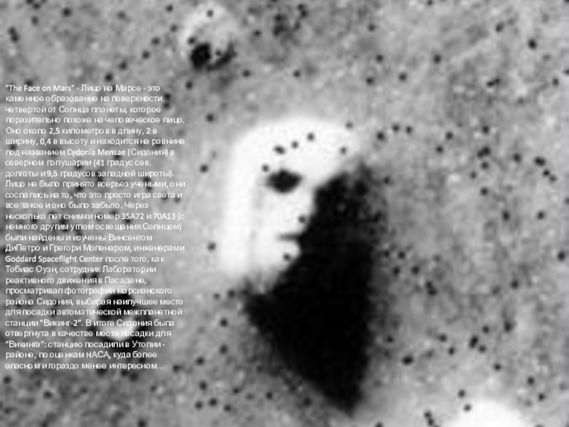 Лицо не было принято всерьез учеными, они сослались на то, что это просто игра света и все такое и оно было забыто. Через несколько лет снимки номер 35A72 и 70A13 (с немного другим углом освещения Солнцем) были найдены и изучены Винсентом ДиПетро и Грегори Моленаром, инженерами Goddard Spaceflight Center после того, как Тобиас Оуэн, сотрудник Лаборатории реактивного движения в Пасадене, просматривал фотографии марсианского района Сидония, выбирая наилучшее место для посадки автоматической межпланетной станции "Викинг-2". В итоге Сидония была отвергнута в качестве места посадки для "Викинга": станцию посадили в Утопии - районе, по оценкам HАСА, куда более опасном и гораздо менее интересном…