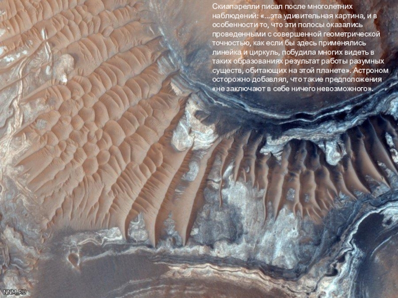 Слайд 12Скиапарелли писал после многолетних наблюдений: «...эта удивительная картина, и в особенности
