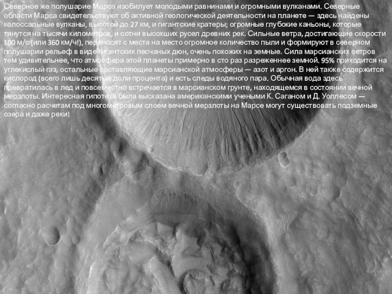 области Марса свидетельствуют об активной геологической деятельности на планете — здесь найдены колоссальные вулканы, высотой до 27 км, и гигантские кратеры; огромные глубокие каньоны, которые тянутся на тысячи километров, и сотни высохших русел древних рек. Сильные ветра, достигающие скорости 100 м/с (или 360 км/ч!), переносят с места на место огромное количество пыли и формируют в северном полушарии рельеф в виде гигантских песчаных дюн, очень похожих на земные. Сила марсианских ветров тем удивительнее, что атмосфера этой планеты примерно в сто раз разреженнее земной. 95% приходится на углекислый газ, остальные составляющие марсианской атмосферы — азот и аргон. В ней также содержится кислород (всего лишь десятые доли процента) и есть следы водяного пара. Обычная вода здесь превратилась в лед и повсеместно встречается в марсианском грунте, находящемся в состоянии вечной мерзлоты. Интересная гипотеза была высказана американскими учеными К. Саганом и Д. Уоллесом — согласно расчетам под многометровым слоем вечной мерзлоты на Марсе могут существовать подземные озера и даже реки!