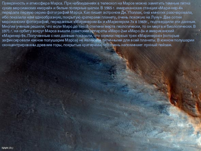 заметить темные пятна сухих марсианских «морей» и белые полярные шапки. В 1965 г. американская станция «Мари-нер-4» передала первую серию фотографий Марса. Как пишет астроном Дж. Поллак, она «многих разочаровала, ибо показала нам однообразную, покрытую кратерами планету, очень похожую на Луну». Две сотни марсианских фотографий, переданных «Маринером-6» и «Маринером-7» в 1969г., подтвердили эти данные. Многие ученые решили, что если Марс до такой степени мертв геологически, то он мертв и биологически. В 1971 г. на орбиту вокруг Марса вышли советские аппараты «Марс-2»и «Марс-3» и американский «Маринер-9». Полученные с них данные показали, что снимки первых трех «Маринеров» (которые зафиксировали южное полушарие Марса) не являются типичными для всей планеты. В южном полушарии сконцентрированы древние горы, покрытые кратерами, что очень напоминает лунный пейзаж.