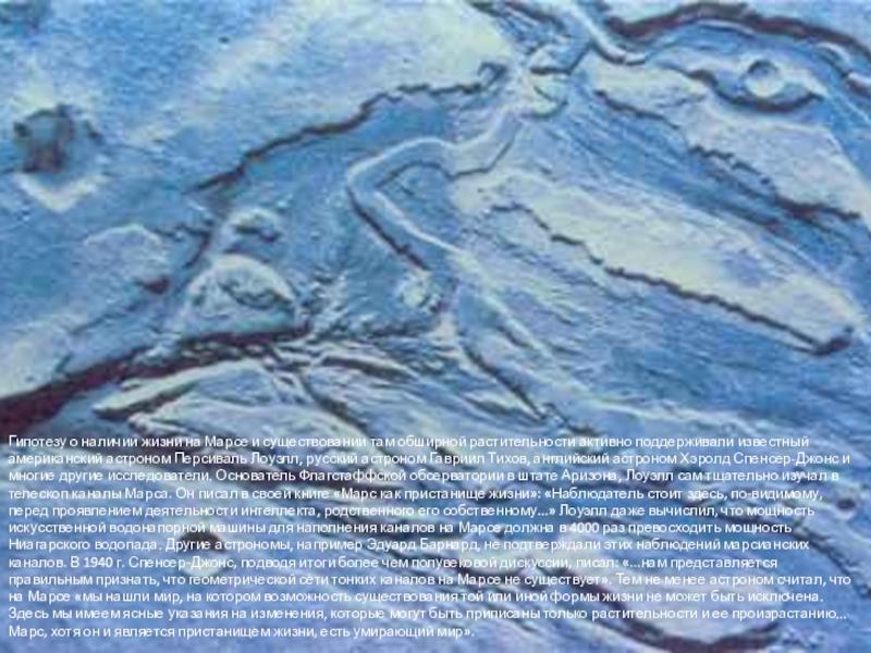 активно поддерживали известный американский астроном Персиваль Лоуэлл, русский астроном Гавриил Тихов, английский астроном Хэролд Спенсер-Джонс и многие другие исследователи. Основатель Флагстаффской обсерватории в штате Аризона, Лоуэлл сам тщательно изучал в телескоп каналы Марса. Он писал в своей книге «Марс как пристанище жизни»: «Наблюдатель стоит здесь, по-видимому, перед проявлением деятельности интеллекта, родственного его собственному...» Лоуэлл даже вычислил, что мощность искусственной водонапорной машины для наполнения каналов на Марсе должна в 4000 раз превосходить мощность Ниагарского водопада. Другие астрономы, например Эдуард Барнард, не подтверждали этих наблюдений марсианских каналов. В 1940 г. Спенсер-Джонс, подводя итоги более чем полувековой дискуссии, писал: «...нам представляется правильным признать, что геометрической сети тонких каналов на Марсе не существует». Тем не менее астроном считал, что на Марсе «мы нашли мир, на котором возможность существования той или иной формы жизни не может быть исключена. Здесь мы имеем ясные указания на изменения, которые могут быть приписаны только растительности и ее произрастанию... Марс, хотя он и является пристанищем жизни, есть умирающий мир».