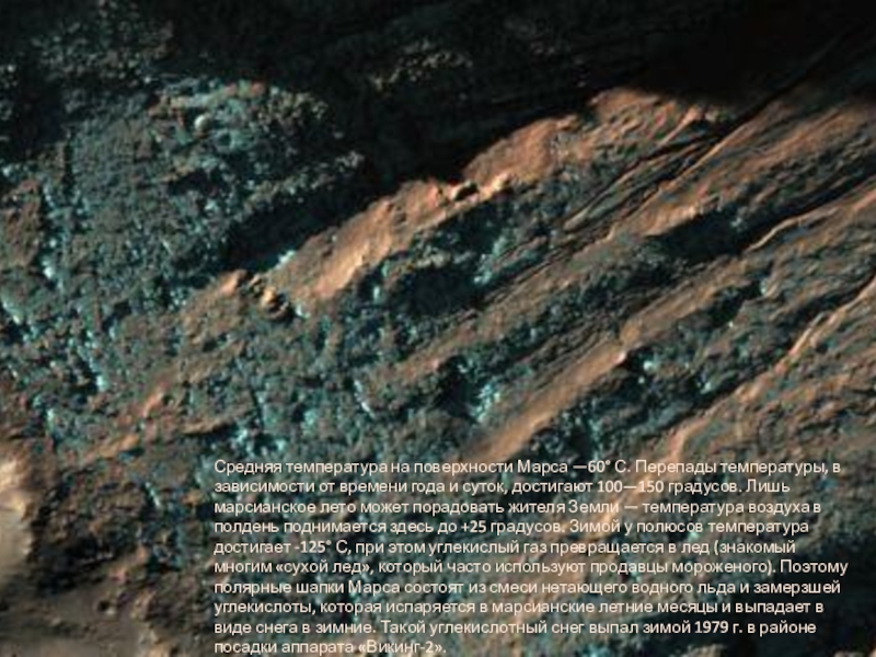 Слайд 10Средняя температура на поверхности Марса —60° С. Перепады температуры, в зависимости