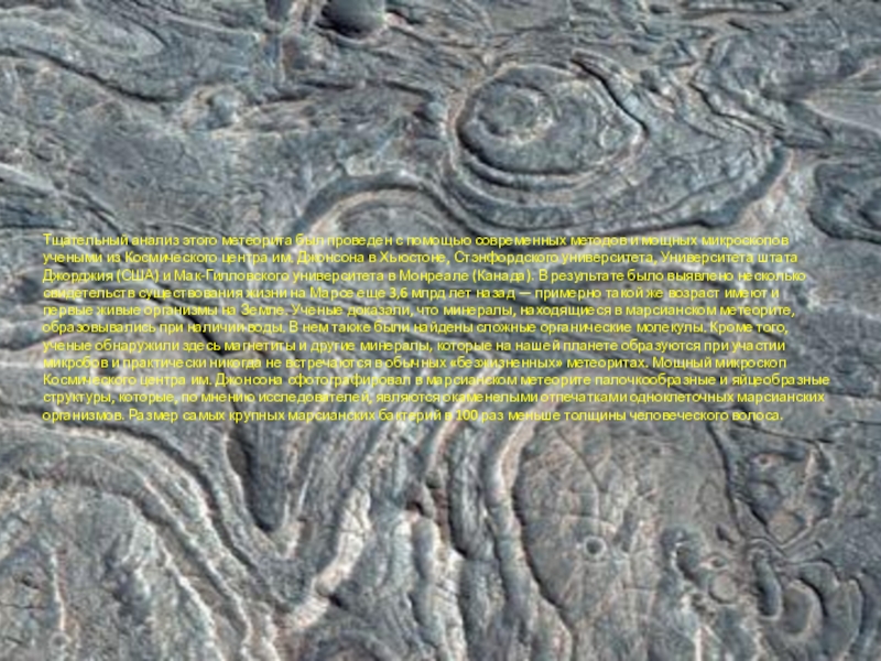 мощных микроскопов учеными из Космического центра им. Джонсона в Хьюстоне, Стэнфордского университета, Университета штата Джорджия (США) и Мак-Гилловского университета в Монреале (Канада). В результате было выявлено несколько свидетельств существования жизни на Марсе еще 3,6 млрд лет назад — примерно такой же возраст имеют и первые живые организмы на Земле. Ученые доказали, что минералы, находящиеся в марсианском метеорите, образовывались при наличии воды. В нем также были найдены сложные органические молекулы. Кроме того, ученые обнаружили здесь магнетиты и другие минералы, которые на нашей планете образуются при участии микробов и практически никогда не встречаются в обычных «безжизненных» метеоритах. Мощный микроскоп Космического центра им. Джонсона сфотографировал в марсианском метеорите палочкообразные и яйцеобразные структуры, которые, по мнению исследователей, являются окаменелыми отпечатками одноклеточных марсианских организмов. Размер самых крупных марсианских бактерий в 100 раз меньше толщины человеческого волоса.