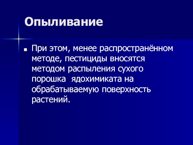 При этом, менее распространённом методе, пестициды вносятся методом распыления сухого порошка