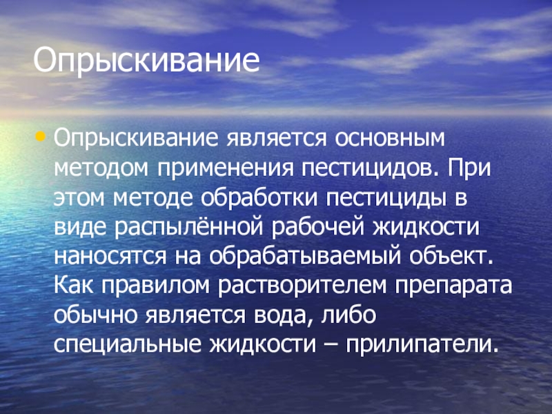 Опрыскивание является основным методом применения пестицидов. При этом методе обработки пестициды
