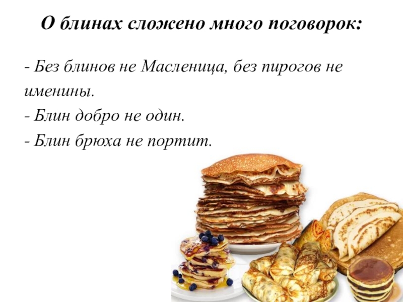 О блинах сложено много поговорок: - Без блинов не Масленица, без пирогов не именины. - Блин добро