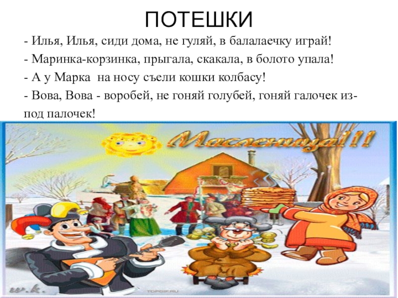 ПОТЕШКИ- Илья, Илья, сиди дома, не гуляй, в балалаечку играй! - Маринка-корзинка, прыгала, скакала, в болото упала!