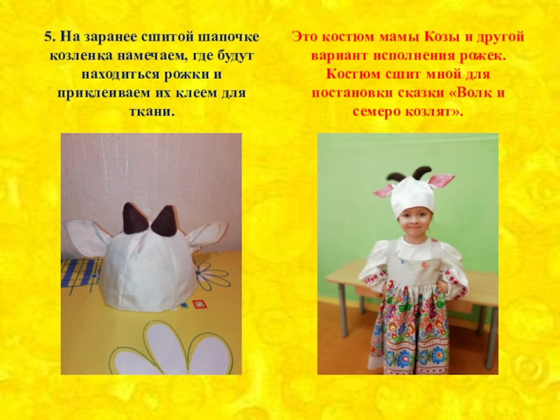 Это костюм мамы Козы и другой вариант исполнения рожек. Костюм сшит мной для постановки сказки «Волк и семеро козлят».