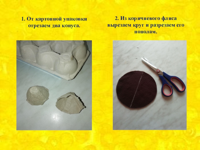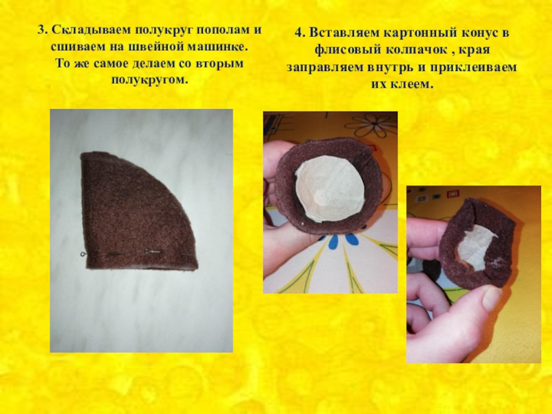 4. Вставляем картонный конус в флисовый колпачок , края заправляем внутрь и приклеиваем их клеем.