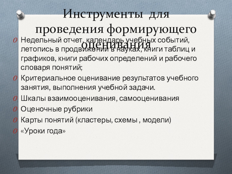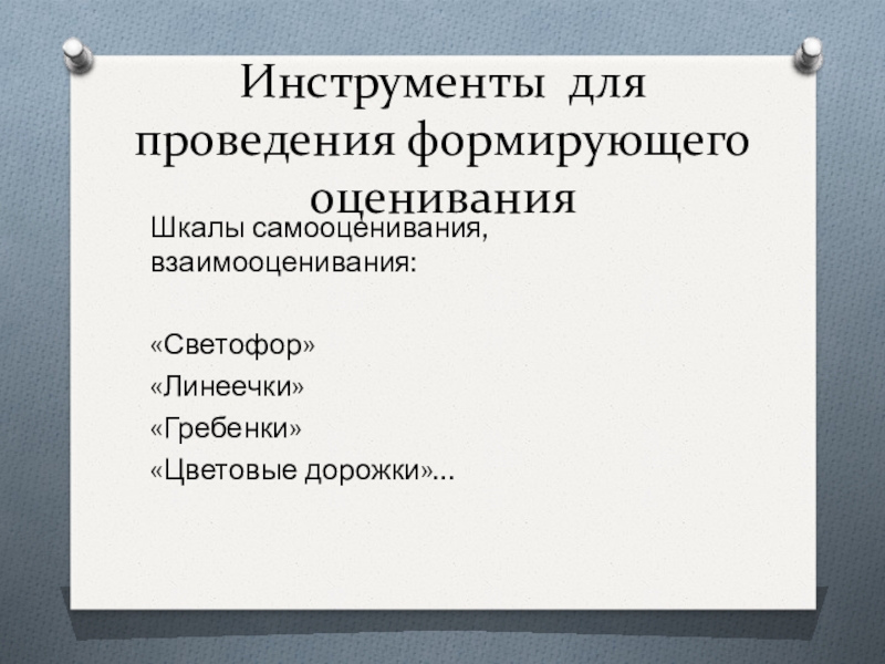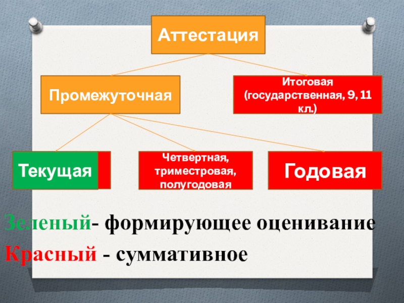 образом интегрированным в образовательную практику. В зависимости от этапа обучения используются диагностическое (стартовое, текущее) и срезовое (тематическое, промежуточное, рубежное, итоговое) оценивание.
