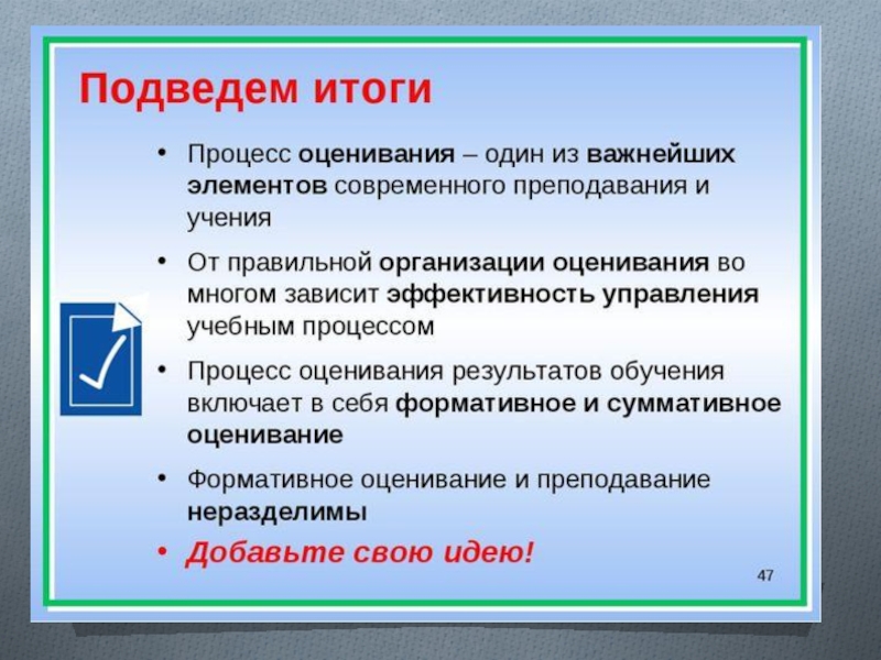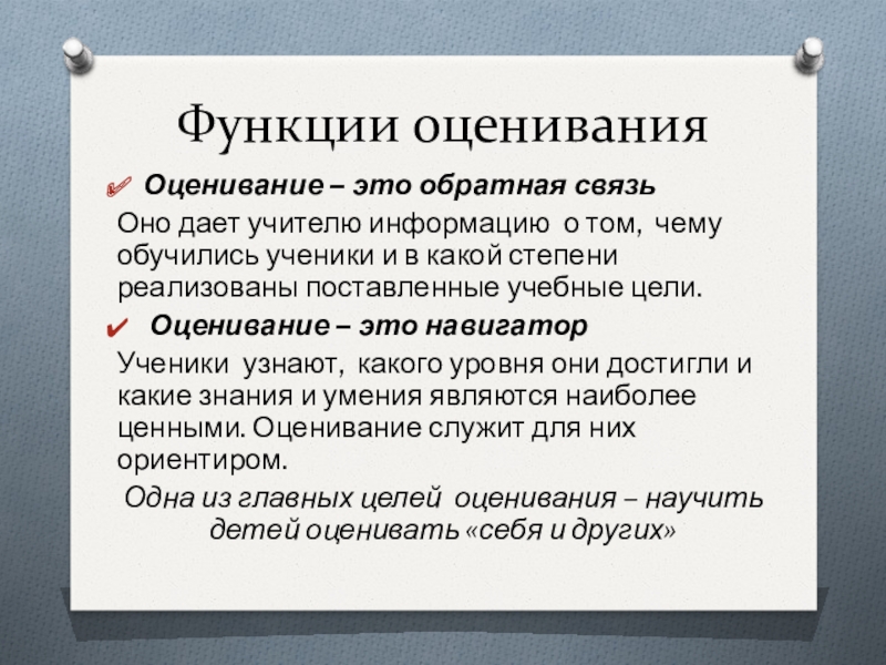 Ученики узнают, какого уровня они достигли и какие знания и умения являются наиболее ценными. Оценивание служит для них ориентиром.