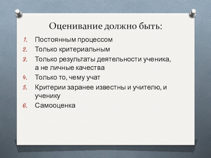 Оценивание может быть только критериальным, т.е. необходимо определение степени индивидуального приближения ученика к ожидаемым результатам образования. Основными критериями оценивания выступают ожидаемые результаты, соответствующие учебным целям.