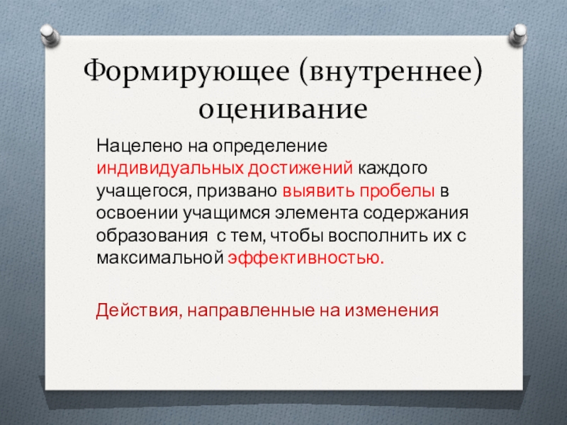 Нацелено на определение индивидуальных достижений каждого учащегося, призвано выявить