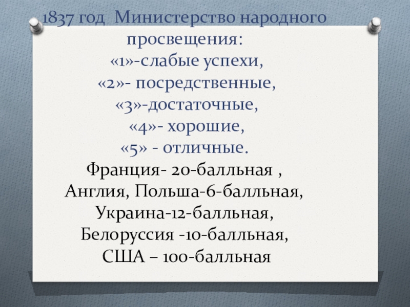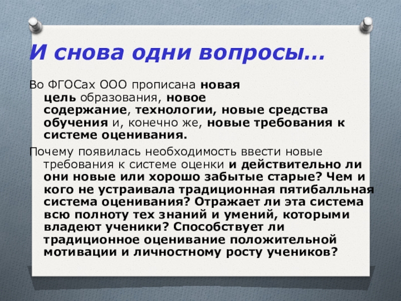 Почему появилась необходимость ввести новые требования к системе оценки и действительно ли они новые или хорошо забытые старые? Чем и кого не устраивала традиционная пятибалльная система оценивания? Отражает ли эта система всю полноту тех знаний и умений, которыми владеют ученики? Способствует ли традиционное оценивание положительной мотивации и личностному росту учеников?
