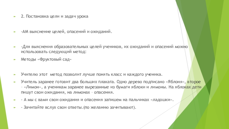 Учитель заранее готовит два больших плаката. Одно дерево подписано «Яблоня», второе – «Лимон», а ученикам заранее вырезанные из бумаги яблоки и лимоны. На яблоках дети пишут свои ожидания, на лимонах – опасения.