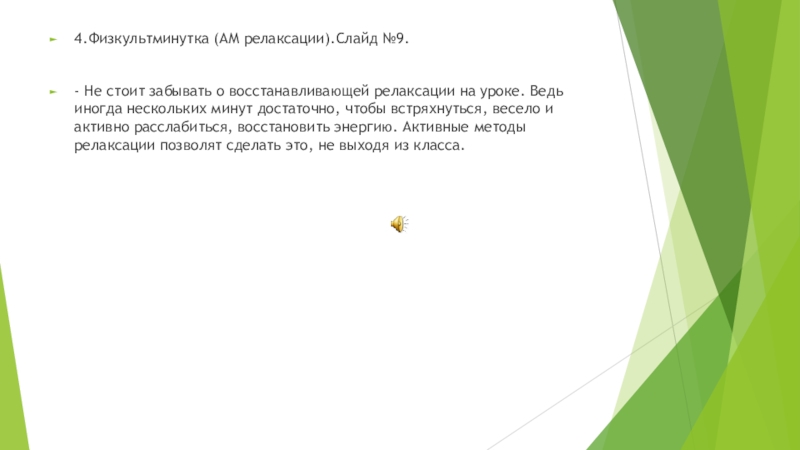Слайд 104.Физкультминутка (АМ релаксации).Слайд №9.