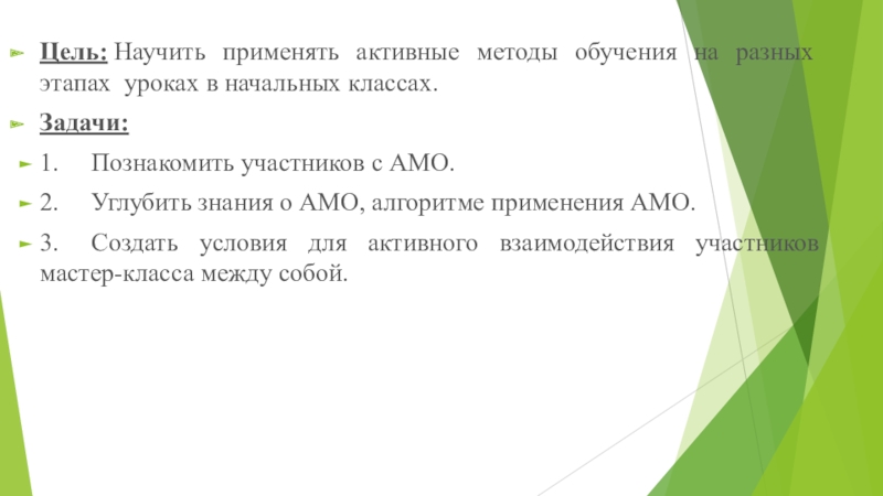 Слайд 2Цель: Научить применять активные методы обучения на разных этапах уроках в начальных