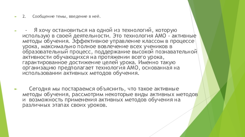 хочу остановиться на одной из технологий, которую использую в своей деятельности. Это технология АМО - активные методы обучения. Эффективное управление классом в процессе урока, максимально полное вовлечение всех учеников в образовательный процесс, поддержание высокой познавательной активности обучающихся на протяжении всего урока, гарантированное достижение целей урока. Именно такую организацию предполагает технология АМО, основанная на использовании активных методов обучения.