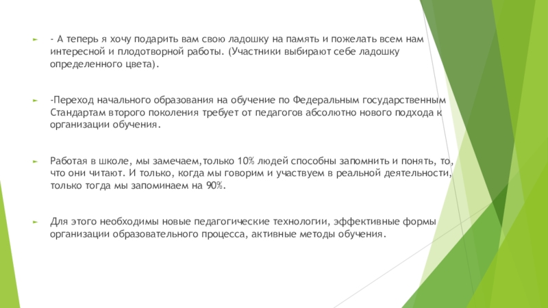 Работая в школе, мы замечаем,только 10% людей способны запомнить и понять, то, что они читают. И только, когда мы говорим и участвуем в реальной деятельности, только тогда мы запоминаем на 90%.