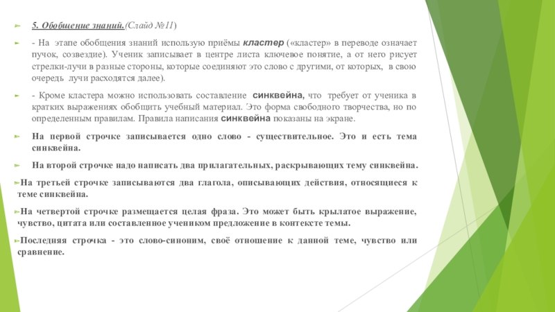 - Кроме кластера можно использовать составление синквейна, что требует от ученика в кратких выражениях обобщить учебный материал. Это форма свободного творчества, но по определенным правилам. Правила написания синквейна показаны на экране.
