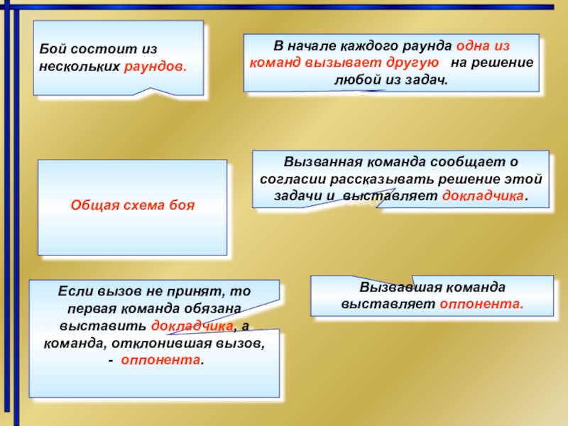 В начале раунда докладчик рассказывает решение у доски. Доклад должен содержать ответы на все поставленные в задаче вопросы и доказательства их правильности.