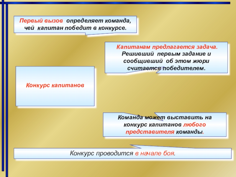 Капитанам предлагается задача. Решивший первым задание и сообщивший об этом жюри считается победителем.