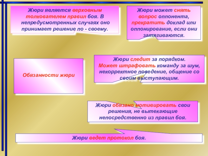 Жюри обязано мотивировать свои решения, не вытекающие непосредственно из правил боя.