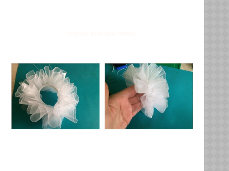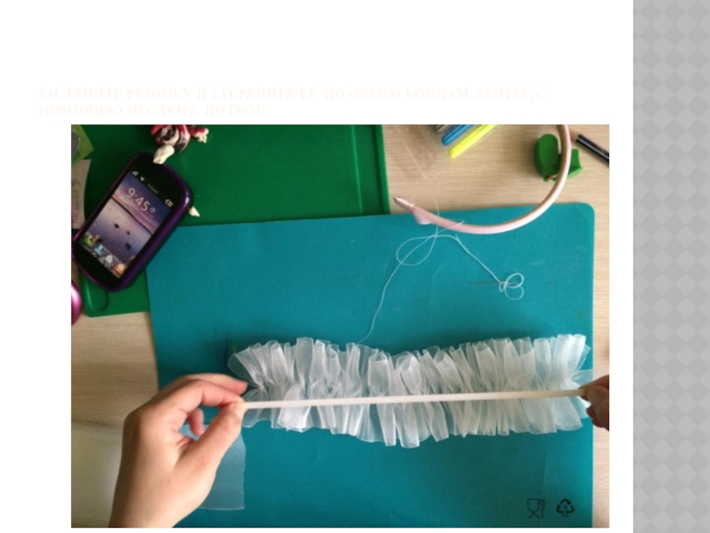 Слайд 7Растяните резинку и закрепите ее по обеим концам ленты , с